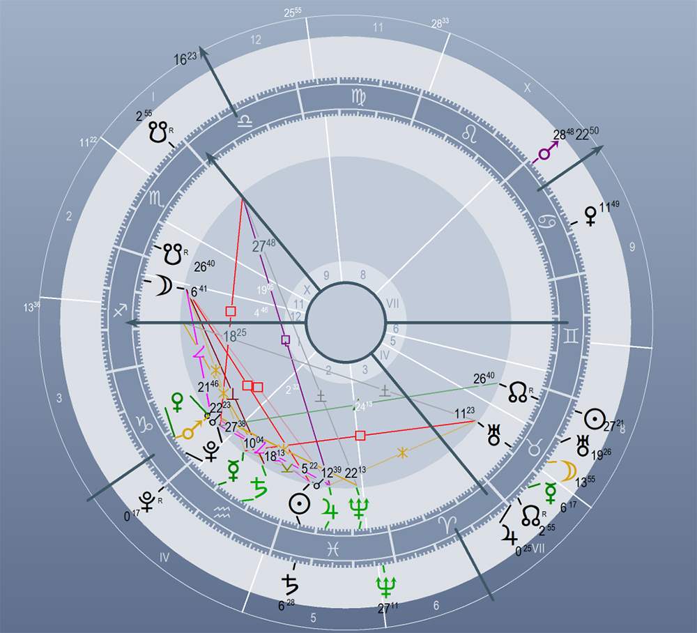 Feltehetjük a kérdést, akkor mégis mire jó az egész? A képletben jelen van egy látható folyamat, amelyben az agresszori állapot fenntartása vagy el nem vesztése a cél. A Plútó, amely szintén a háború megvalósítója, rossz fényszögben van az MC- vel, vagyis az egzisztencia tengellyel, így az IC-vel is, amely a végkifejlet és az otthon, a nép háza.