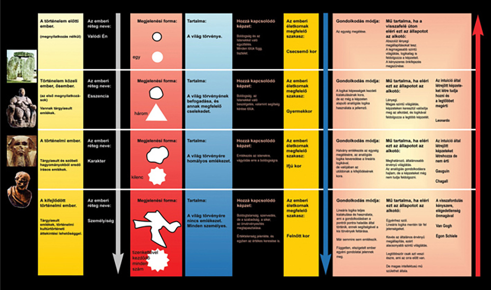 Elsősorban kultúrtörténeti alapú megközelítésre, és merészen átívelő magatartásra van szükség ahhoz, hogy meg tudjunk állapítani valamit, ami az emberről, az alkotó emberről szól. Ebben a részletek nagy jelentőségűek lehetnek, de még fontosabb a nagyvonalú összefüggések keresése. Ennek a kérdésnek a feldolgozásához született egy táblázat.